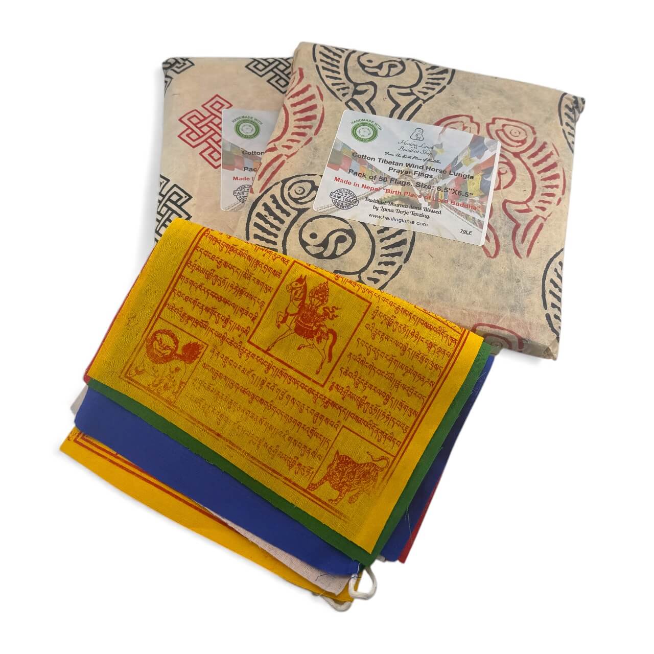 Healing Lama Original Tibetan Windhorse Prayer Flags. Authentic Buddhist Flags Blessed by a Lama ~ Pack of 50 Flags – 6.5″X6.5″. These are 100% Real Cotton.